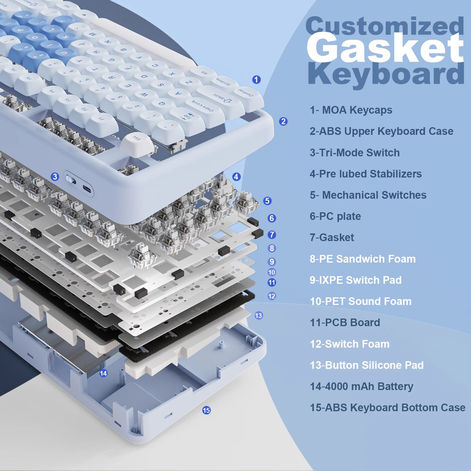 The mechanical keyboard features a gasket mount structure, filled with 5 layers of Padding, which contains PE Sandwich Foam, IXPE Switch Pad, PET Sound Foam, Switch Foam, and Silicone Bottom Pad. This construction not only reduces noise while typing but also increases the durability and stability of the gasket keyboard, giving users a comfortable and quiet typing experience.